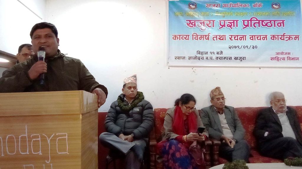नेपालगन्ज, १ माघ – बाँकेको खजुरा गाउँपालिकाले भाषा, साहित्य, कला र संस्कृतिको संरक्षण र उत्थानका लागि स्थापित गरेको, खजुरा प्रज्ञा प्रतिष्ठानको साहित्य विभागद्वारा काव्य विमर्श तथा रचना वाचन कार्यक्रम सम्पन्न भएको छ ।