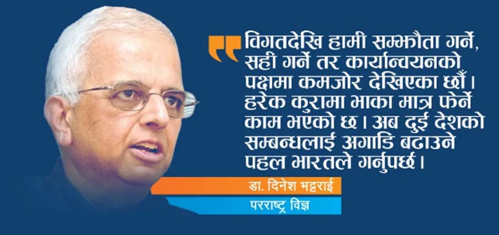 प्रधानमन्त्री पुष्पकमल दाहाल ‘प्रचण्ड’को भारत भ्रमणका क्रममा महत्त्वपूर्ण ७ बुँदामा सम्झौता भएको छ। त्यो सम्झौताले यो भ्रमण केही फलदायी उन्मुख भएको जस्तो भएको छ। तर सहमति र सम्झौतालाई मात्रै आधार मान्ने हो भने यो भन्दा अगाडिका जति पनि कुराहरू छन् ती पुरा हुन बाँकी नै छन्। अहिले भइरहेका सम्झौताले के कस्तो सन्देश प्रवाह गर्यो ? पटक पटक हुने भ्रमण र यो भ्रमणमा कस्तो फरक आयो ? यसै विषयमा आधारित रहेर अन्तर्राष्ट्रिय सम्बन्धका जानकार परराष्ट्रविद् डा. दिनेश भट्टराईसँग नयन सापकोटाले गरेको कुराकानीको सम्पादित अंश :