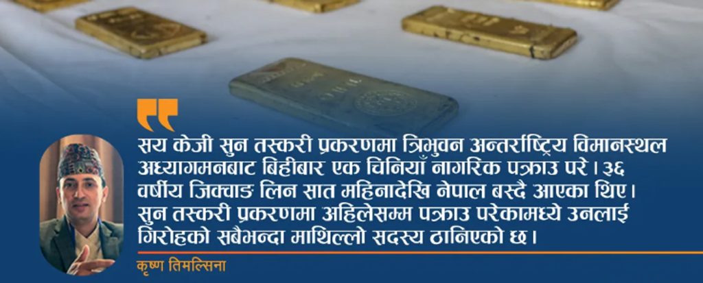 आशंका कै बीचमा त्रिभुवन अन्तर्राष्ट्रिय विमानस्थल अध्यागमनबाट बिहीबार एक चिनियाँ नागरिक पक्राउ परे। जो एक सय केजी सुन पक्राउ परेको समाचार बाहिरिए लगत्तै चीन उड्न लागेका थिए। ७ महिनादेखि नेपाल बस्दै आएका ३६ वर्षीय जी क्वाङ लिन एक क्विन्टल सुन तस्करी प्रकरणमा अहिलेसम्म पक्राउ परेको गिरोहको सबैभन्दा माथिल्लो सदस्य ठानिएको छ। किनकी, चिनियाँ नागरिक जी क्वाङ लिनले उक्त तस्करीको सामान राख्न कोठा भाडामा लिएको भनिएको बालुवाटारको एक घरमा छापा मारेपछि चिनियाँ नागरिक जी चीन उड्न लागको सूचना प्रहरीले पाएको थियो। तत्कालै अध्यागमनलाई नाम पठाएर विमानस्थलमा निगरानी गर्दा चीन भाग्ने तयारीमा रहेका ती व्यापारी विमानस्थलबाटै पक्राउ परेका थिए।