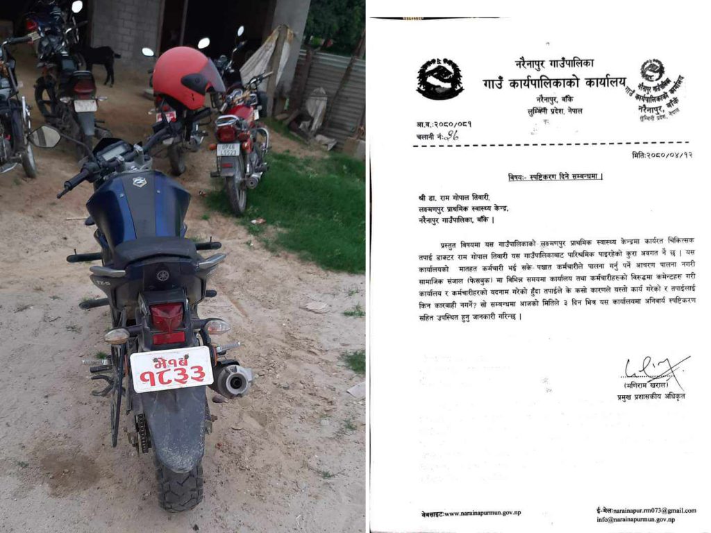 सो विषयमा कानुन व्यवसायी रामकुमार दीक्षितले आफ्नो सार्वजनिक सञ्जाल प्रयोग गर्दै “नरैनापुर पालिका भित्र भूकम्प आउने संभावना…. यो मोटर साइकिल कसको जिम्मामा छ र कसले चलाएको हो ?? मलाई जानकारी छैन र चलाउने संग मेरो कुनै रिसइबी पनि छैन तर के जानकारी छ भने जनता को पैसा ले खरीद गरिएको हो र जनता कै पैसाले तेल पनि हालिएको छ । प्रसंगबश फोटो सार्वजनिक गर्नु परेको हो ।