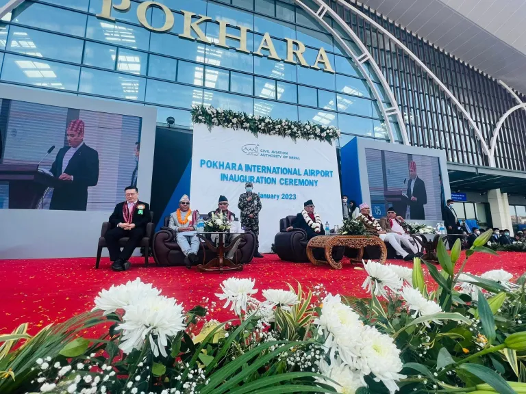 पोखरा अन्तर्राष्ट्रिय विमानस्थल २०२३ को जनवरीमा सुरुवात भएको हो। यसको डिजाइन र निर्माण चीन सरकारको सहयोगमा भएको हो। चाइनिज इन्जिनियरिङबाट यो निर्माण भएको हो। अन्ततः हामीले अन्तर्राष्ट्रिय उडानको सफल अवतरण गरेका छौँ, पोखरा अन्तर्राष्ट्रिय विमानस्थल बीआरआई परियोजना अन्तर्गतको हो। राजदूतले पटकपटक बीआरआई अन्तर्गतको महंगो ऋण भनिरहँदा कार्यक्रममा उपस्थित विभागीय मन्त्री किराती भने चीनको प्रशंसा गरिरहेका थिए।