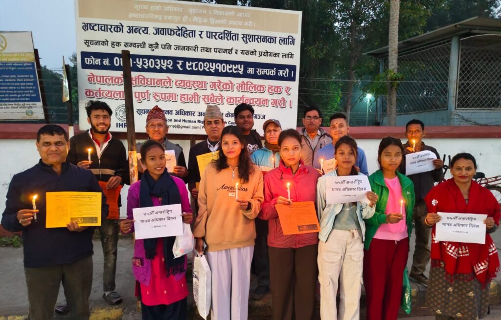 दिवसको अवसरमा सूचना र मानव अधिकार अनुसन्धान केन्द्र नेपालगन्जले आईतबार साँझ जिल्ला प्रशासन कार्यालयको मुल गेटमा आयोजना गरेको दिप प्रज्वलन कार्यक्रमका सहभागीले व्यक्तिगत स्वतन्त्रता र लोकतान्त्रिक शासन प्रणालीलाई सारभूत बनाउने मानव अधिकारको महत्वपूर्ण पक्ष आर्थिक, सामाजिक तथा सांस्कृतिक अधिकार भएको बताएका थिए ।