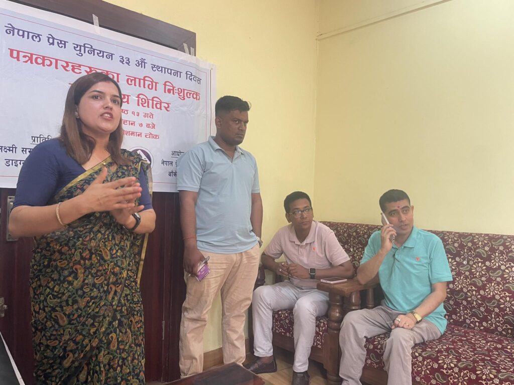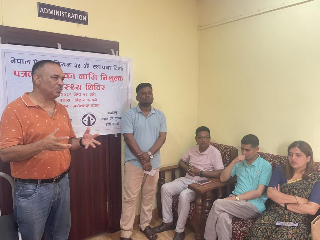नेपालगन्ज, १३ जेठ – नेपाल प्रेस युनियनको ३३ औं स्थापना दिवसको अवसरमा बाँकेमा पत्रकारहरुका लागि निःशुल्क स्वास्थ्य परीक्षण शिविर गरिएको छ । युनियन बाँकेले स्थापना दिवसको अवसरमा सम्पूर्ण पत्रकारहरुका लागि आईतबार नेपालगन्जमा निःशुल्क स्वास्थ्य परीक्षण शिविर सञ्चालन गरेको हो ।
