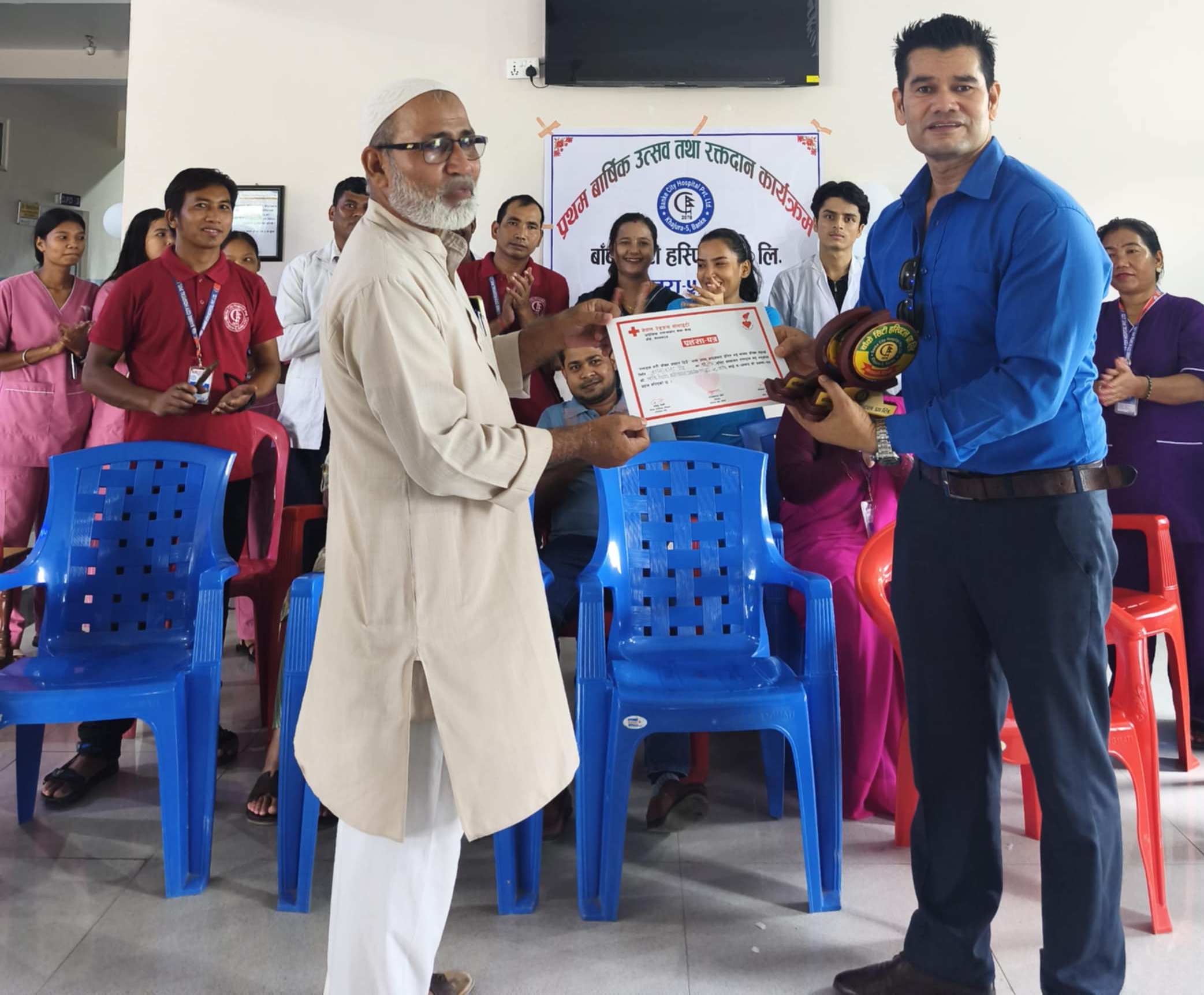 सो कार्यक्रममा मानबीय कार्य, रक्तदान कार्यक्रमको आयोजना गरी सहयोग गर्नुभएकोमा बाँके सिटी हस्पिटल प्रा.लि. खजुराका अध्यक्ष अब्दुल कादीर शेषलाई खजुरा रक्त सञ्चार केन्द्रका प्रमुख होमराज गिरीले प्रशंसा–पत्र प्रदान गर्नु भएको थियो भने कार्यक्रमको समापनमा बाँके सिटी हस्पिटल प्रा.लि.का आमना शेषले रक्तदान कार्यक्रममा प्राविधिक सहयोग पु¥याए बापत मायाको चिनो प्राविधिकद्वय होमराज गिरी र सन्दिप आचार्यलाई मायाको चिनो प्रदान गर्नु भएको थियो ।