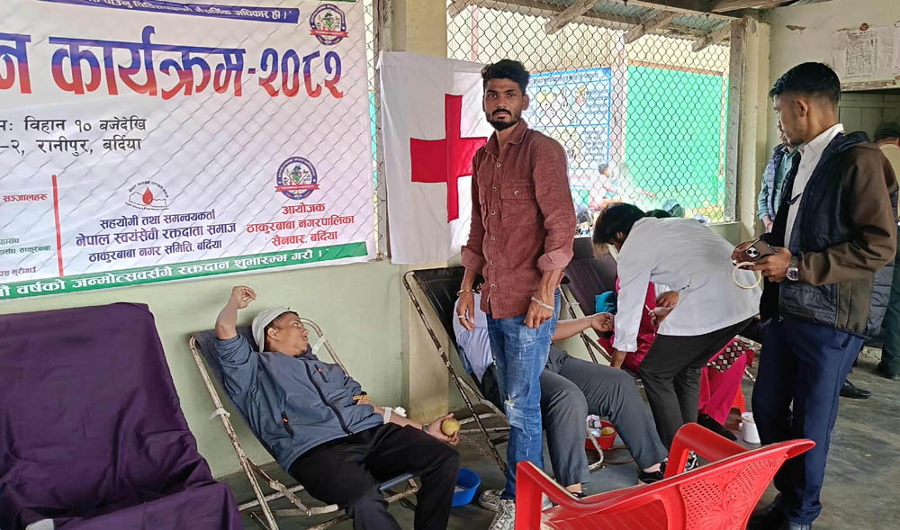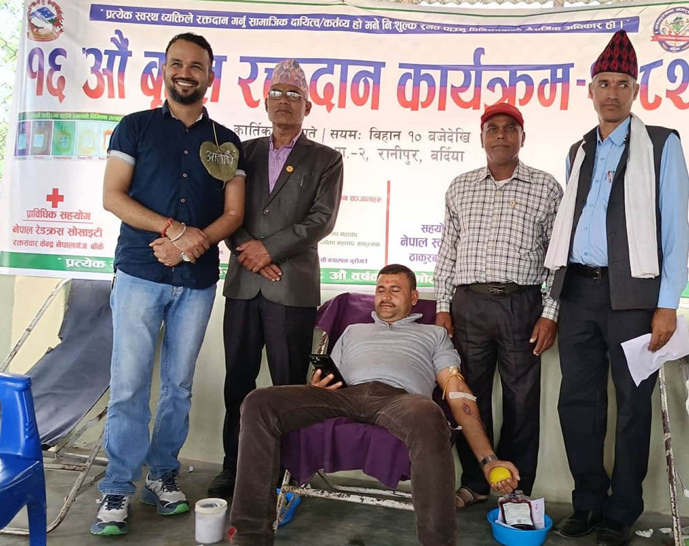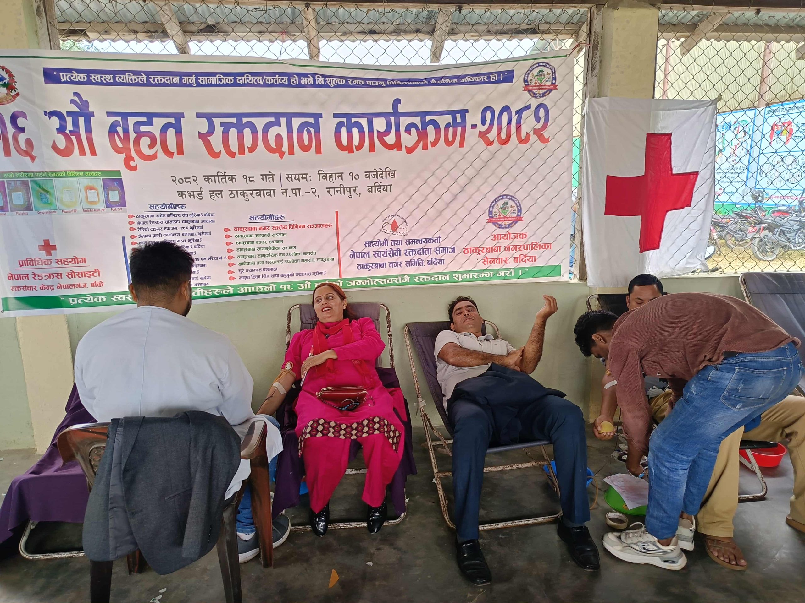 नेपालगन्ज, २० कार्तिक – बर्दियाको ठाकुरबाबाको भुरीगाउँमा १६ औंं पटक आयोजित “रक्तदान जीवन दान” भन्ने उद्देश्यका साथ रक्तदान कार्यक्रममा १३ जना महिला र ८१ जना पुरुष गरी ९४ जनाले रक्तदान गरेका छन् ।