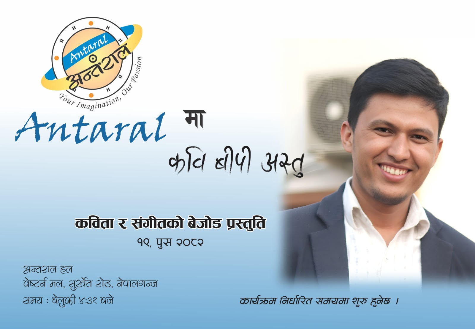 नेपालगन्ज सुर्खेत रोडस्थित वेष्टर्न मलमा रहेको अन्तराल हलमा हुने उक्त कार्यक्रममा सशुल्क सहभागिताको व्यवस्था गर्न लागिएको पनि शाहले जानकारी दिए । अन्तराल डेढ दशक बढी समयदेखि सन्चार, कला, साहित्य, गीतसंगीत, खेलकुद, ईभेन्ट म्यानेजमेन्ट र पर्यावरणका क्षेत्रमा काम गर्दै आएको संस्था हो ।