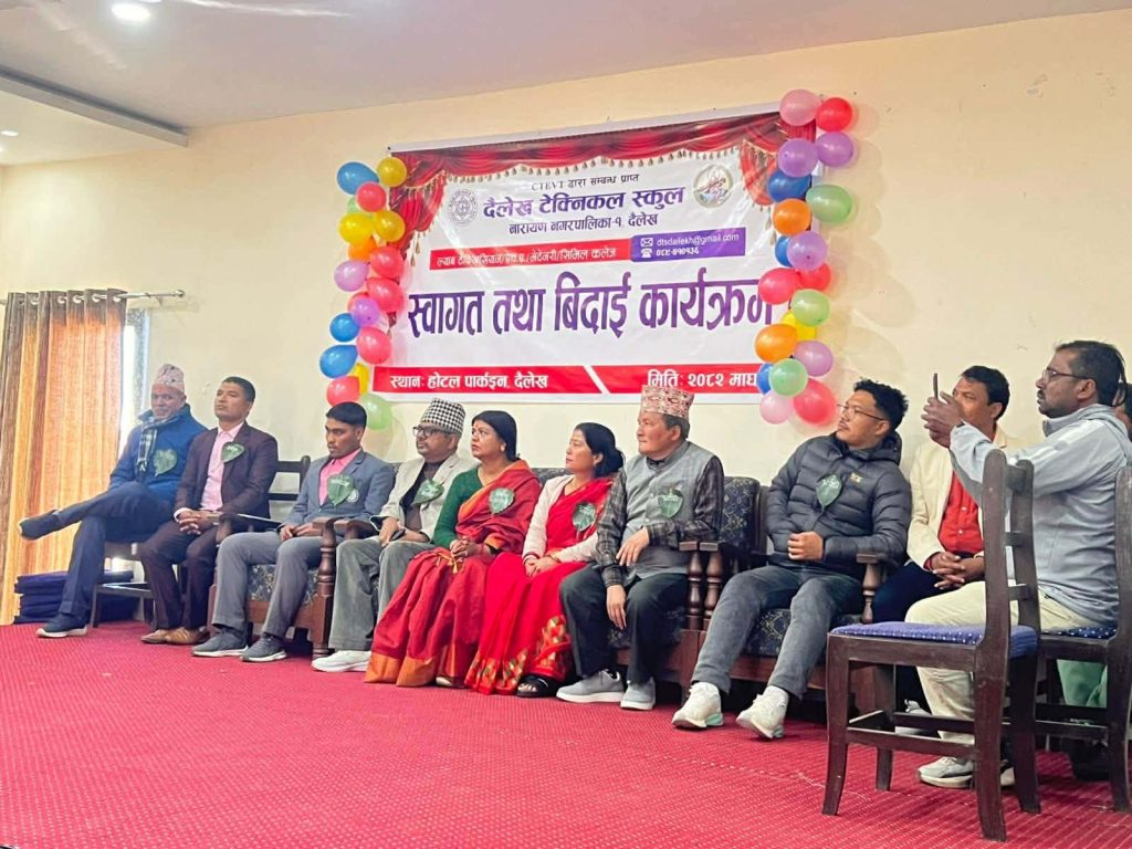 दैलेख, २५ माघ – नारायण नगरपालिका वडा नं. १ मा अवस्थित दैलेख टेक्निकल स्कुलमा स्वागत तथा विदाई कार्यक्रम एक विशेष समारोहका बीच सम्पन्न भएको छ । शिक्षालयका अध्यक्ष तथा कार्यक्रमका प्रमुख अतिथि अरुण पाण्डेयले वर्तमान समयमा सैद्धान्तिक ज्ञानभन्दा व्यवहारिक र प्राविधिक शिक्षाको आवश्यकता बढी रहेको बताए। पाण्डेयले विद्यार्थीहरूलाई दक्ष जनशक्तिका रूपमा तयार हुन आग्रह गर्दै स्कुलको शैक्षिक गुणस्तर विकासको लागि सधैं प्रतिबद्ध रहेको बताए। त्यस्तै, विशिष्ट अतिथि शिक्षालय संचालिका लता पाण्डेयको गरिमा मय आतिथ्यता रहेको थियो ।