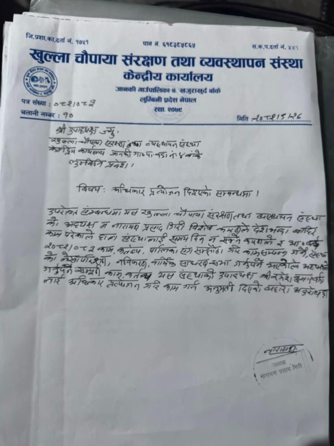 यसअगावै खुल्ला चौपाया संरक्षण तथा व्यवस्थापन संस्थाका अध्यक्ष नारायणप्रसाद गिरीले २०८२÷९÷२७ मा ‘अधिकार प्रत्योजन दिईएको सम्बन्धमा’ संस्थाका उपाध्यक्ष एवं जानकी गा.पा. वडा नं. ४ का वडाअध्यक्ष रमेशकुमार बर्मालाई पत्र पठाईसकेको स्रोतको दाबी रहेको भएपनि वडाअध्यक्ष बर्माले यसबारे आफूलाई कुनै जानकारी नै नभएको बताउँछन् ।