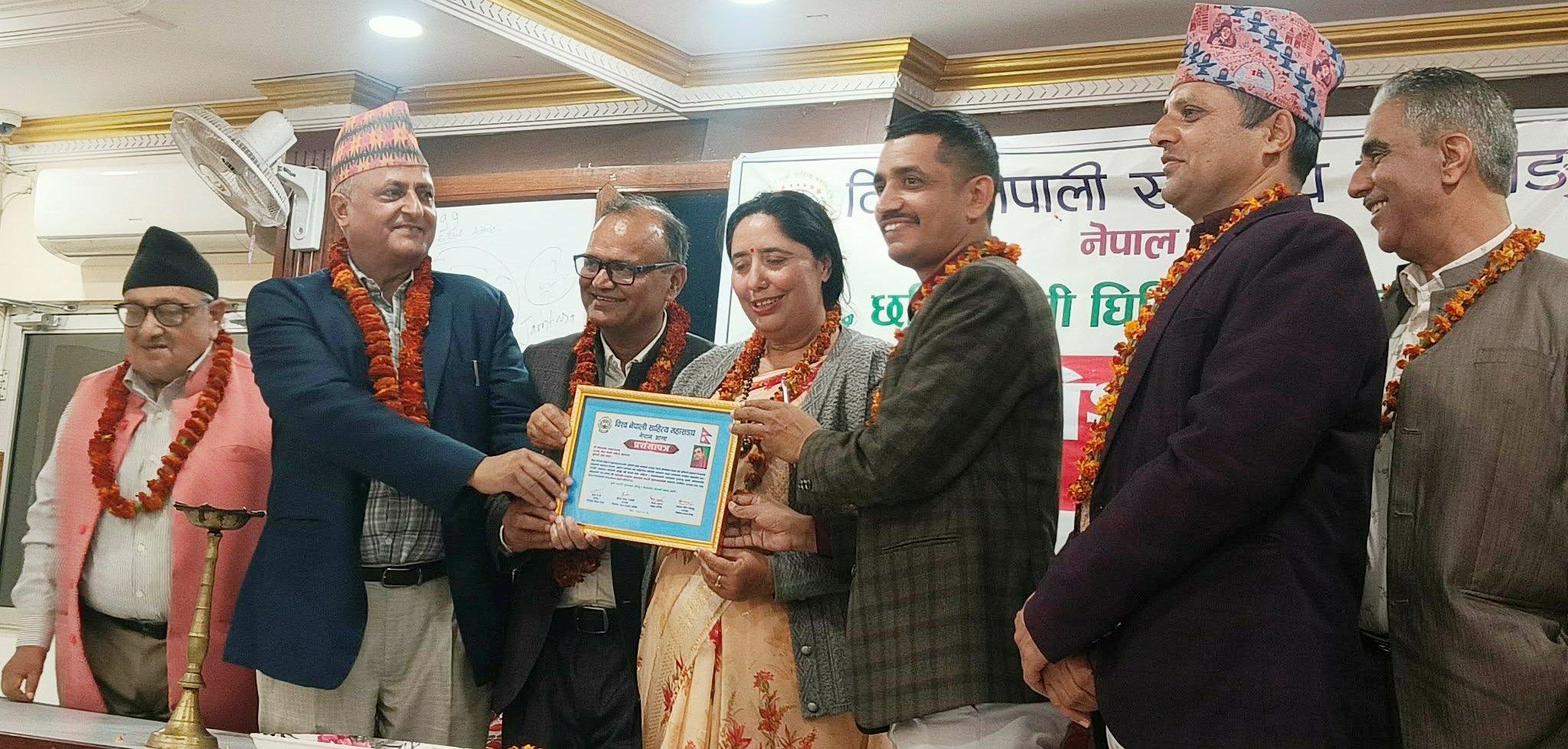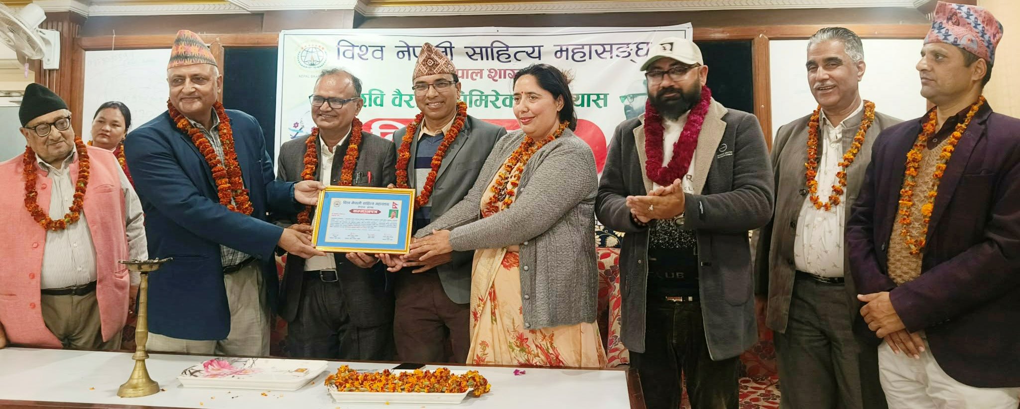 विश्व नेपाली साहित्य महासंघ नेपाल शाखाका सचिव लेक प्रसाद प्याकुरेलद्वारा सञ्चालित कार्यक्रमको पहिलो चरणमा लुम्बिनी प्रदेशमा रहेर साहित्य सेवामा समर्पित प्राज्ञ महानन्द ढकाललाई सम्मान गरिनुका साथै विनेसाम लुम्बिनी प्रदेशलाई उचाई प्रदान गर्नुहुने प्रदेशका अध्यक्ष लेकप्रसाद प्याकुरेललाई कदर–पत्र प्रदान गरिएको थियो ।