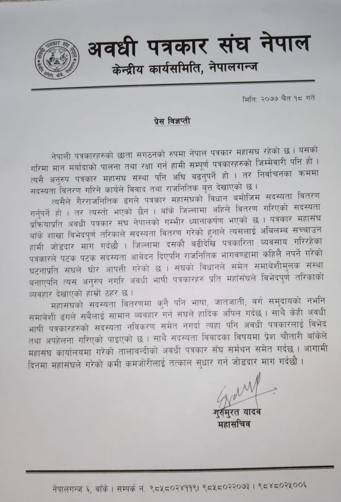 विज्ञप्तीमा अगाडी – “त्यसैले गैरराजनितिक ढंगले पत्रकार महासंघको विधान बमोजिम सदस्यता वितरण गर्नुपर्ने हो । तर त्यस्तो भएको छैन । बाँके जिल्लामा अहिले वितरण गरिएको सदस्यता प्रक्रियाप्रति अवधी पत्रकार संघ नेपालको गम्भीर ध्यानाकर्षण भएको छ । पत्रकार महासंघ बाँके शाखा विभेदपुर्ण तरिकाले सदस्यता वितरण गरेको हुनाले त्यसलाई अबिलम्ब सच्चाउन हामी जोडदार माग गर्दछौ । जिल्लामा दसकौ बढीदेखि पत्रकारिता व्यवसाय गरिरहेका पत्रकारले पटक पटक सदस्यता आबेदन दिएपनि राजनितिक भागवण्डामा कहिलै नपर्ने गरेको घटनाप्रति संघले घोर आपत्ती गरेको छ । संघको विधानले समेत समाबेशीमुलक संस्था बनाएपनि त्यस अनुरुप नगरि अवधी भाषी पत्रकारहरुलाई विभेदपुर्ण तरिकाको व्यवहार देखाएको हाम्रो ठहर छ ।” भनी लेखिएको छ ।