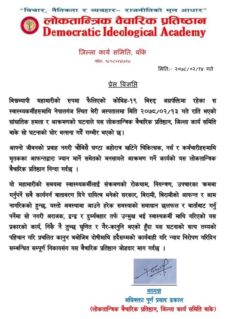 आज शुक्रबार लोकतान्त्रिक वैचारिक प्रतिष्ठान जिल्ला कार्यसमितिले प्रेस विज्ञप्तीमार्फत विश्वव्यापी महामारीको रुपमा फैलिएको कोभिड–१९ विरुद्ध अग्रपंक्तिमा रहेका स्वास्थ्यकर्मीहरु माथि नेपालगन्ज स्थित भेरी अस्पतालमा विहिबार राती भएको सांघातिक हमला र आक्रमणको घोर भत्सर्ना गर्दछ भनी उल्लेख गरेको छ ।