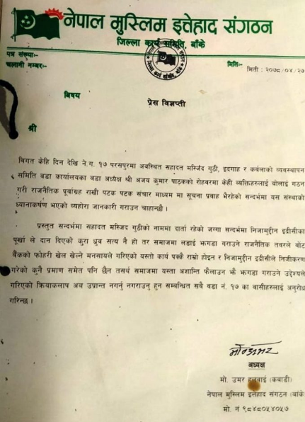 नेपाल मुस्लिम ईत्तेहाद संगठन बाँकेका अध्यक्ष मो. उमर हल्वाई कवाडीले एक विज्ञप्ती जारी गर्दै नेपालगन्ज–१७ का वडा अध्यक्ष अजय पाठकको रोहबरमा केही ब्यक्ति बोलाई राजनीतिक पूर्वाग्रह राखेर नयाँकार्य समिति गठन गरेको प्रति गम्भीर ध्यानाकर्षण भएको जनाउनु भएको छ ।