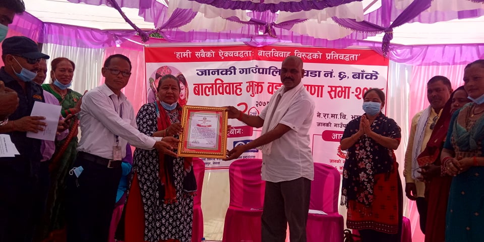 जानकी, २८ भाद्र – बाँकेको जानकी गाउँपालिका वडा नं. ६ लाई आज बालविवाह मुक्त वडा घोषणा गरिएको छ । योसँगै जानकी गाउँपालिकाका अब ६ वटै वडा बालविवाह मुक्त घोषणा भएका छन् ।