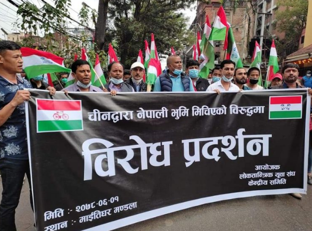 लोसपा नेपाल निकट युवा संघ, विद्यार्थी संगठनले नेपालको भुमी चीनकाे बिस्तारवाद नितिको विरुद्ध आज काठमाडौंको माइतीघर मण्डलामा शान्ति पुर्ण बिरोध गरिएको छ। नेपालको ७ जिल्लाको ११ ठाँउमा र करिब चार सय वर्ग किलोमिटर नेपाली भुमी अतिक्रमण र हुम्लाको १२ नम्बरको पिलर पहिलाकै स्थानमा कायम गर्न र अतिक्रमित जग्गा अबिलम्ब फिर्ता गर्न, गराउन बिरोध गरिएको छ ।