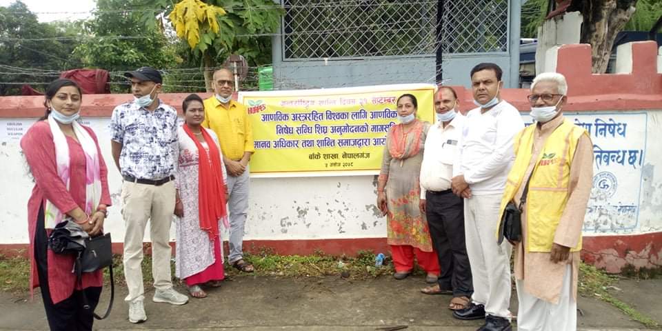 यसैगरी अध्यक्ष भट्टराईका अनुसार आणविक अस्त्र रहित, विश्वकालागी आणविक अस्त्र निषेध सन्धि शिध्र अनुमोदनको माग सहित मंगलवार मानव अधिकार तथा शान्ति समाज बाँके शाखा नेपालगन्जले प्रदर्शनको आयोजना गरेको बताए ।
